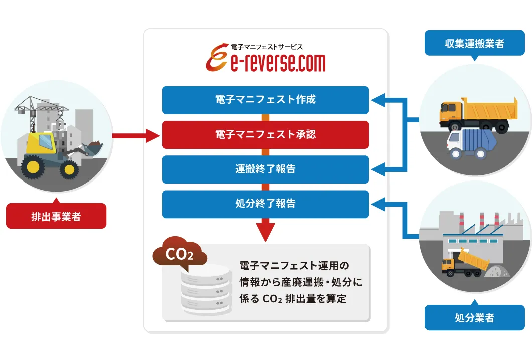 産業廃棄物に係るCO₂排出量は、e-reverse.comに入力した情報から自動算定。CO₂排出量算定のために、現場や集計担当者が新たに何かを入力する必要はありません。